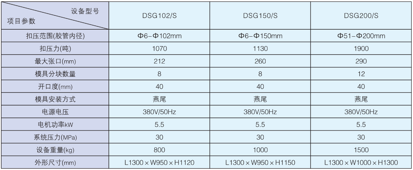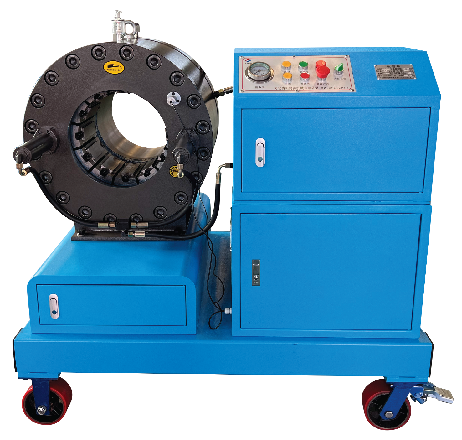 扣压机构是本机工作机构。压套在油缸活塞的带动下实现往复运动,对安装在固定板导套上的弹簧压头不断压紧和放松,将装好的管头,外套、芯子放入弹簧压头中间圆孔内,开动电机、油泵、控制阀,驱使油缸柱塞运动,通过带有锥度内壁的压套,压紧带有同样锥度的弹簧压头外壁,实现压合目的。换向后,压套反方向运动,弹簧压头复原,将高压胶管接头取出。